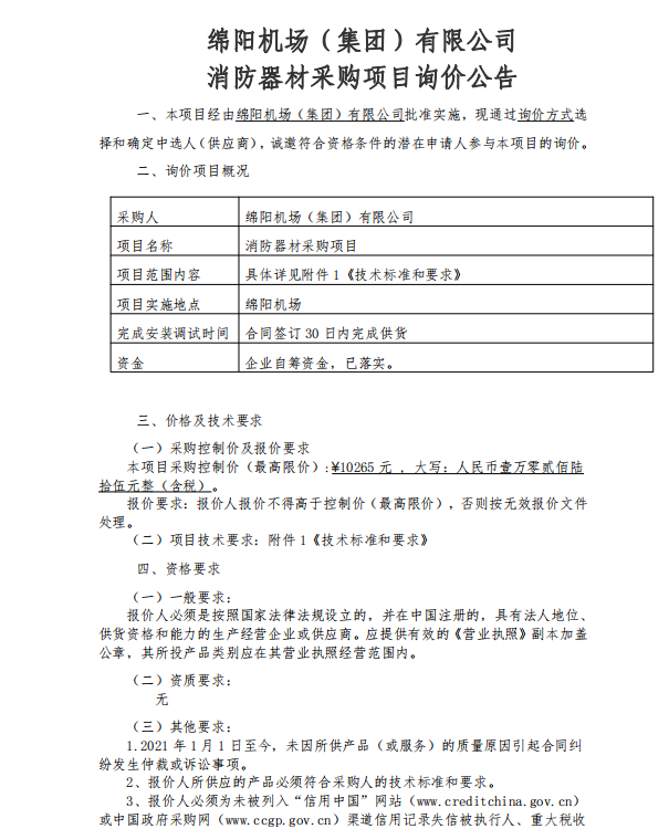 綿陽機(jī)場(集團(tuán))有限公司 消防器材采購項目詢價公告